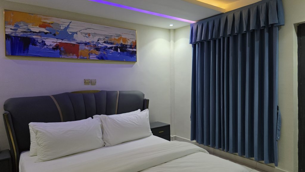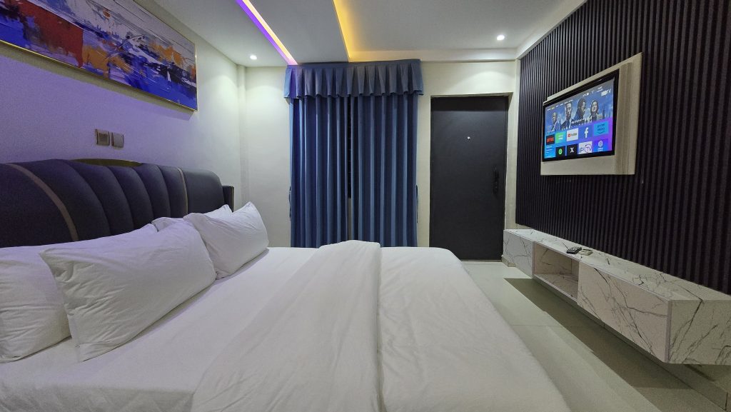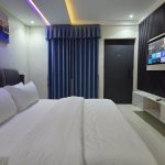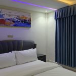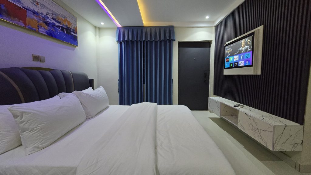 Balcony city view, Non-smoking room, King size bed, 43″ Smart TV, Refrigerator, Air Conditioned, Electric Kettle, Tea cups, Bathroom, Toilet, Bathroom amenities, Shower, Hairdryer, Linen and Towels, Shampoo, Body Wash, Wardrobe, Artworks, spacious balcony with table and two chairs.